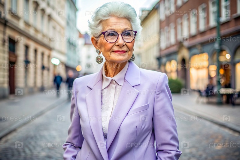 Портрет стильной, модной пожилой женщины, пенсионерки 70 лет, на улице города с очками и ярко-фиолетовым костюмом