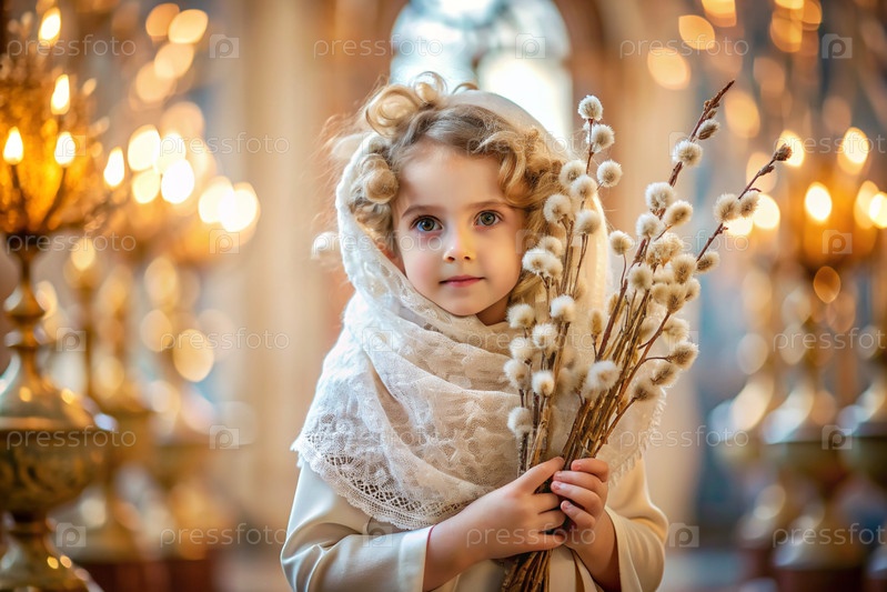 Пальмовое воскресенье. христианство. портрет трехлетней девочки в русском народном шале с ветвями ивы в руках на фоне православной церкви