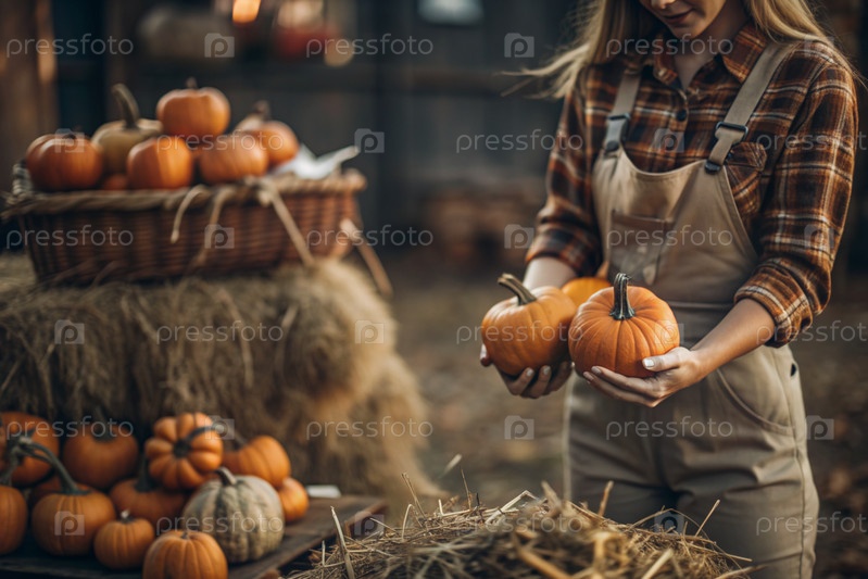 Руки женщины в квадратной рубашке с тыквенным крупным планом и красивым осенним рисунком. Сбор тыков. Концепция празднования Дня благодарения и Хэллоуина