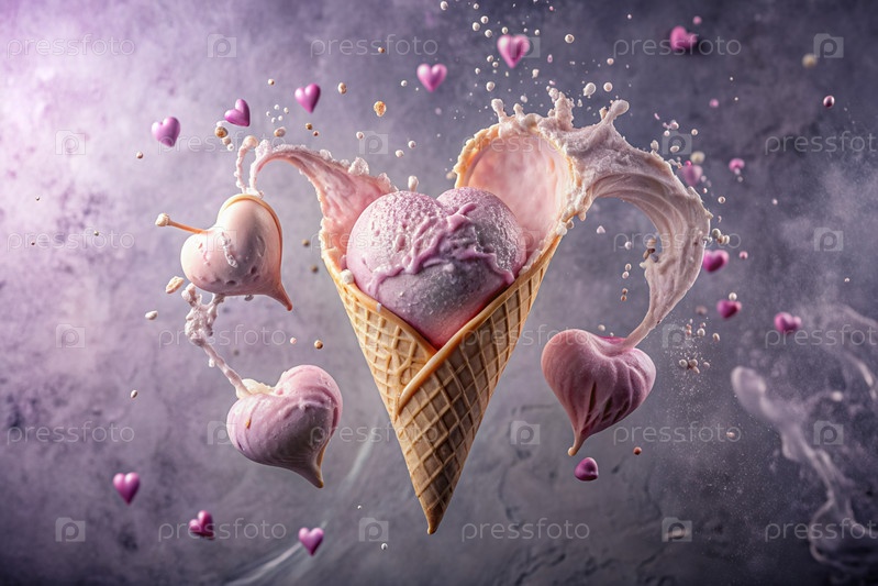 Сладкий десерт. Любовь к мороженому. Сердечно-образный конус мороженого с брызгами, сердцами и пятнами. Концепция Дня святого Валентина. Баннер, реклама