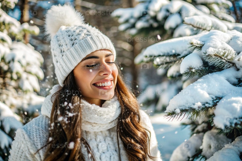 Зимний портрет. Близкий план молодой женщины с выразительными голубыми глазами в вязанной шляпе, шарфе и свитере