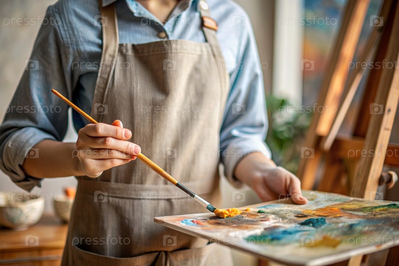 Близко. Понятие творческой деятельности. Художник в мастерской с маслом и кистью в руках. Искусство, креативность и отдых