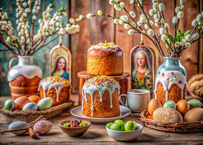 Православный Пасхальный торт, окрашенные яйца, иконы, лица святых, цветы, церковные свечи и пасхальное украшение на деревянном столе в старом деревенском доме