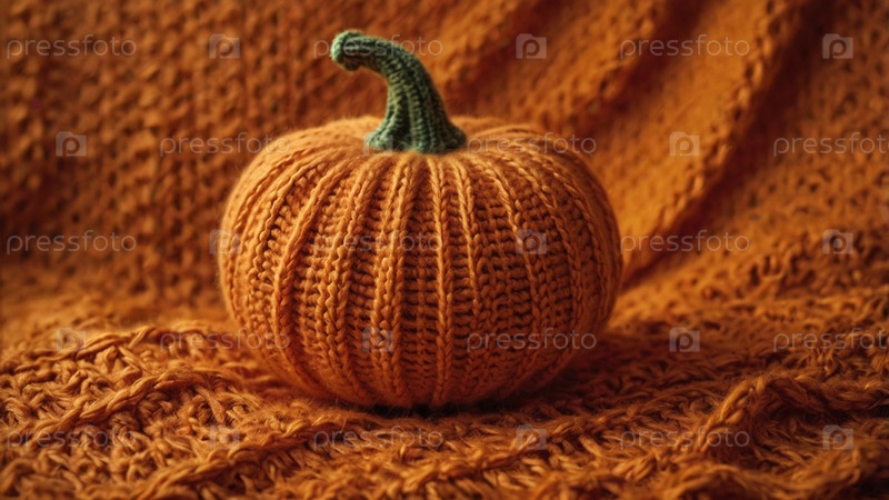 Красивый осенний фон. Хэллоуин, День благодарения. Оранжевая вязаная тыква на фоне оранжевого волокна