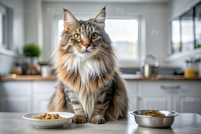 Милая кошка Майкун рядом с миской для кормления на белой кухне.Котка смотрит в камеру.Уход за животными