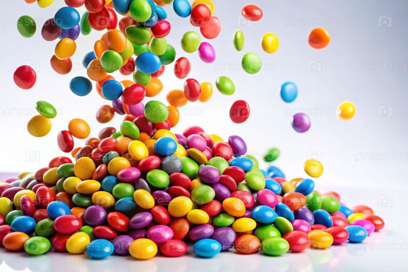 Цветные конфеты в ассортименте на белом фоне. Различные сладости, кондитерские изделия и драже различных форм и цветов. Яркие тени радуги