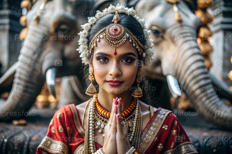 Красивая индийская девушка в традиционном национальном костюме, сари. со слонами. портрет символизирует традиции, культуру и красоту народа Индии