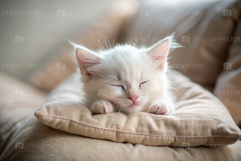 Милый чистый белый пушистый котенок спит на подушке у окна.Кошка удобно расположилась в своем любимом месте, чтобы отдохнуть под солнцем