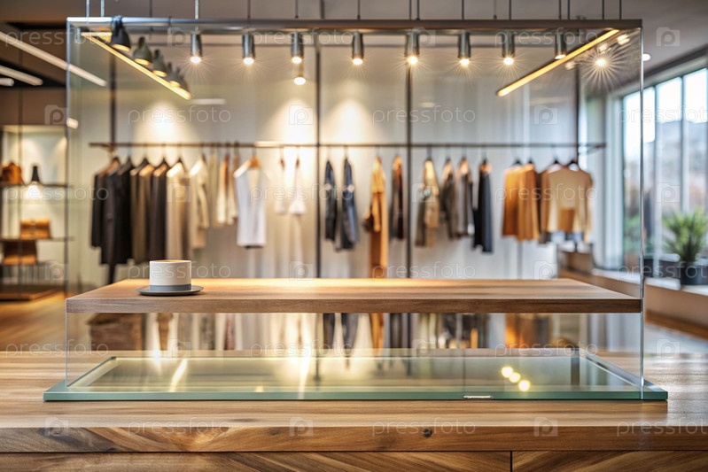 Минимальный фон для демонстрации продукта.Современный стеклянный подиум со стеклянной стеной в современном магазине одежды.Элегантный дизайн для презентации продукции