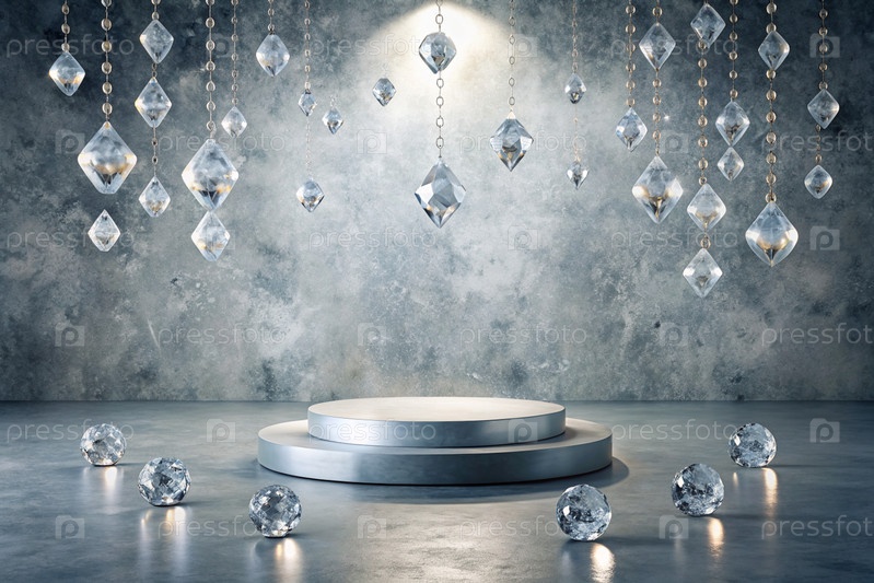 Минималистский фон для выставки ювелирных изделий. Современный пустой подиум с серой стеной и бриллиантами. Креативный дизайн презентации продукта