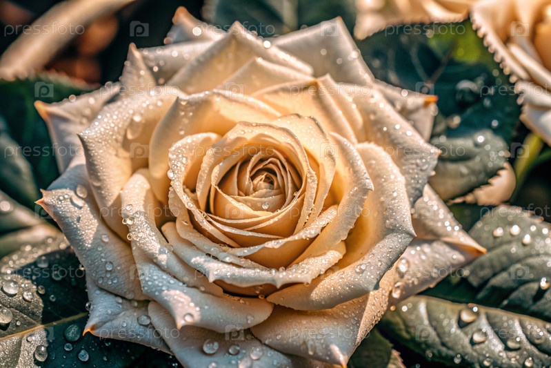 Кремовая роза красивого цвета кофе или шампанского, покрытая росой на рассвете. Красивое солнечное сияние. Фон изображения выполнен в зеленых и бежевых тонах. Естественный, экологически чистый естественный фон