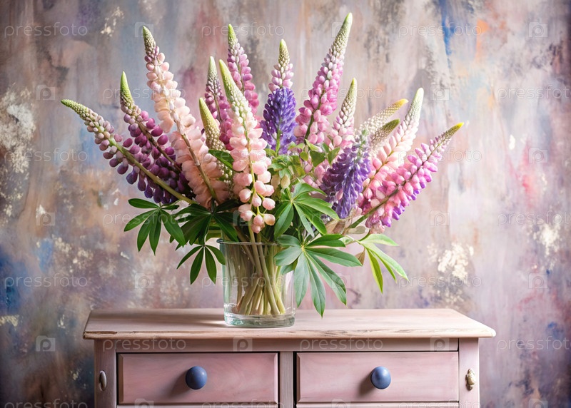Красивый букет розовых, белых и фиолетовых люпин в стеклянной вазе и флаконы на старом деревянном шкафу. Букет цветов в вазе в интерьере дома. Светлый, бежевый, розовый, фиолетовый, цветный фон