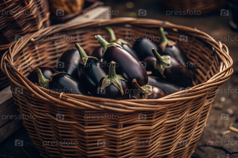 Концепция выращивания продуктов питания. свежие органические баклажаны на фермерском рынке. богатый урожай баклажан в плетеновой корзине