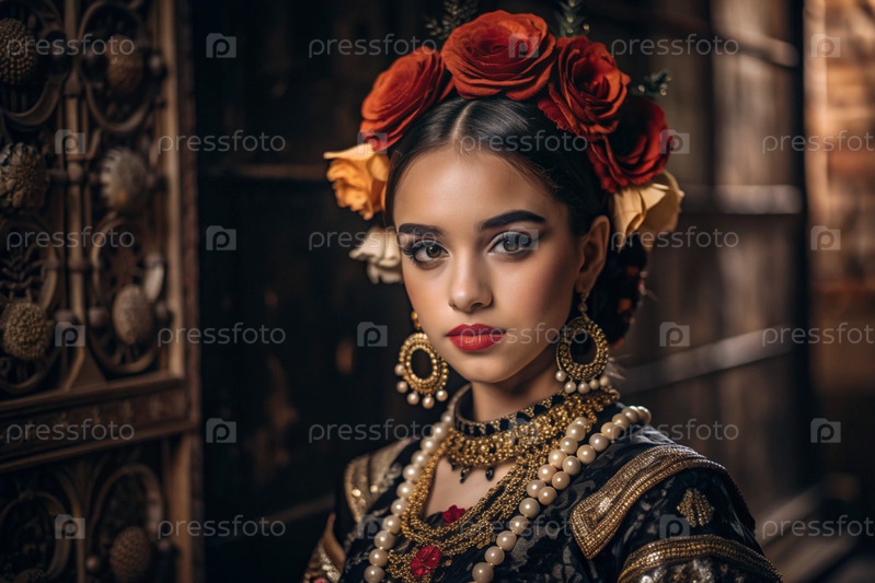 Испанская девушка в традиционном испанском национальном костюме. Перед быком. Бикоборство. Портрет символизирует традиции и культуру народа Испании