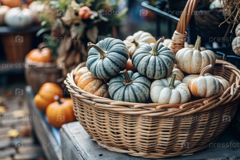 Осенний фон красочные декоративные тыквы в плетеновой корзине богатый урожай концепция Хэллоуина