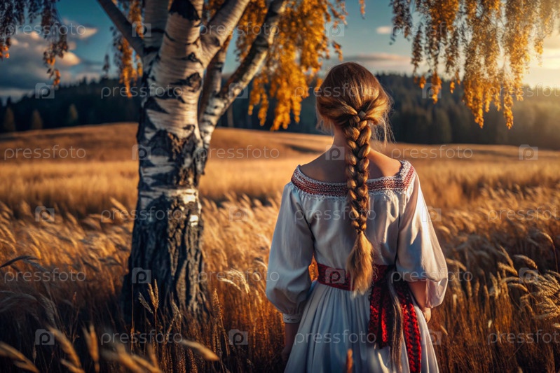 Девушка в традиционном русском льняном наряде и с сковородой на голове на поле спелой золотистой пшеницы на фоне березы и православной церкви