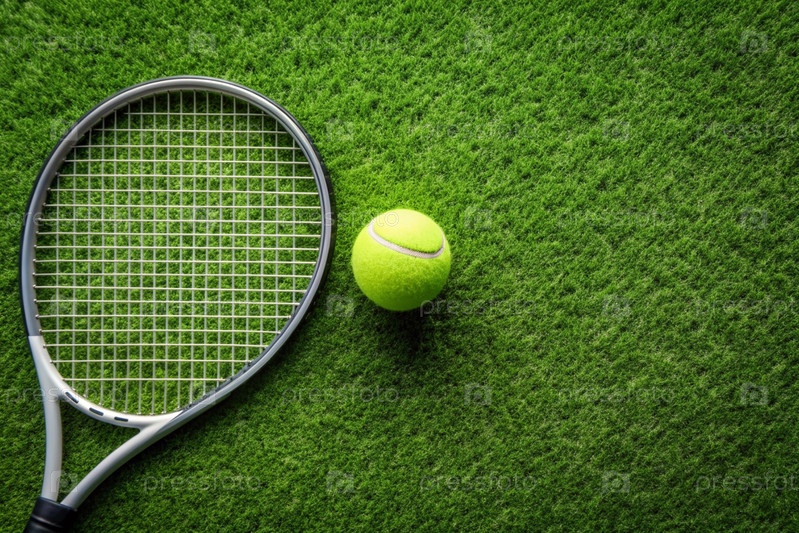 На лужайке жёлтый теннисный мяч и теннисная ракетка, летний вид спорта