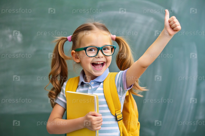 Красивая девушка в очках показывает класс своей рукой. Ребенок идет в школу впервые. Ребёнок с школьной сумкой и книгой. Ребенок в классе со доской на заднем плане. Назад в школу