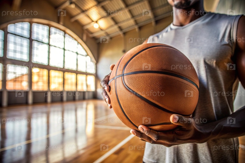 Чернокожий баскетболист держит мяч перед кортом для баскетбола.Руки и мяч в ближайшем плане