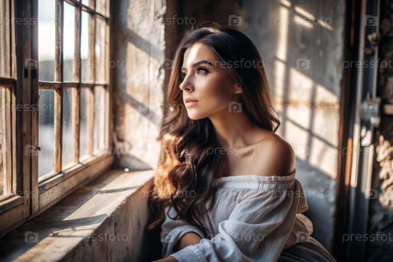 Портрет красивой девушки с кудрявыми волосами у окна старого дома, в котором светит теплое яркое солнце. Романтическое изображение. Одиночество, пустота и ожидание