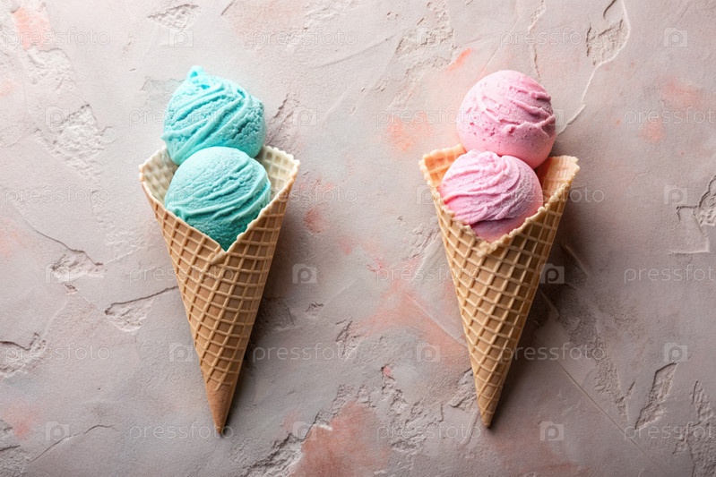 Баннер.Сладкий десерт.Конусы мороженого с разными вкусами.Голубое, розовое мороженое на фоне двух пастельных цветов: синего и розового