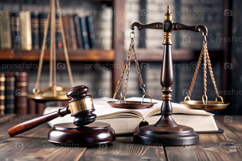 Древесный молоток, книги и весы на столе