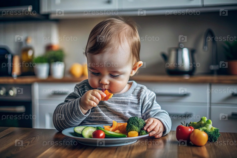 Здоровое детское питание. Первая еда. Кормить ребенка. Милый ребенок ест свежие овощи