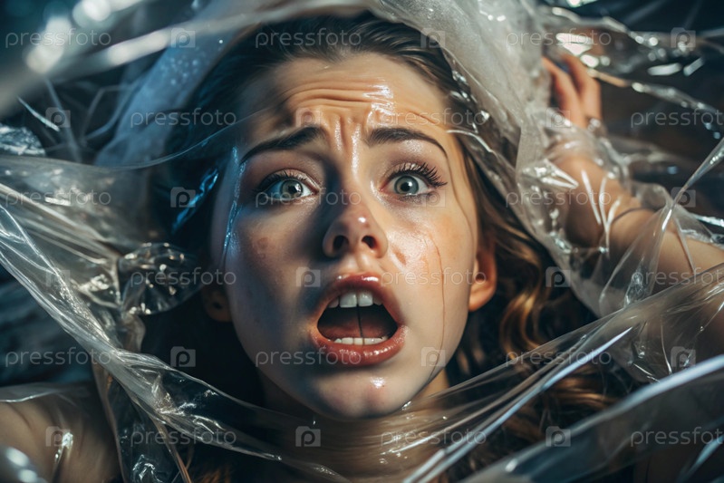 Девочка завернута в целлофан или сумку. Девушка задыхается. Пластиковое загрязнение планеты. Опасность для окружающей среды. Сокращение повторного использования пластика. Переработка. Концепция мусора