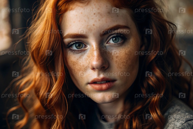 Глубокий эмоциональный портрет.Лицо молодой девушки без макияжа, с выразительными глазами, кудрявыми красными волосами и веснушками на лице. Естественная женская красота