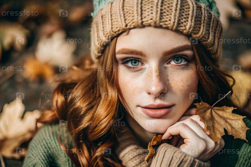 Осенний портрет. Близкий план молодой рыжеволосой женщины с выразительными зелеными глазами в вязанной шляпе и свитере
