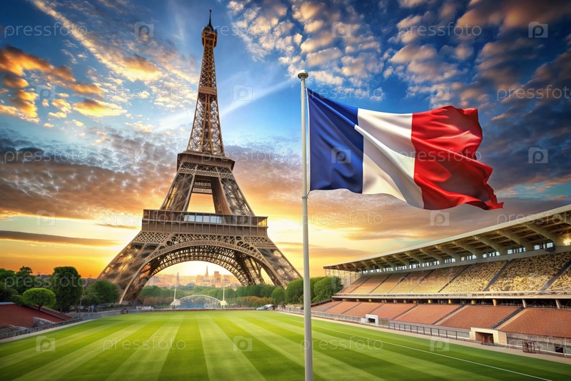 14 июля - Национальный день Франции. Государственный флаг Франции на Эйфелевой башне. Триколор. Концепция Олимпийских игр во Франции 2024