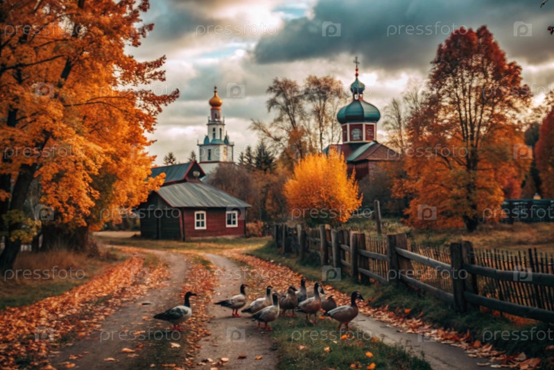 Осенний пейзаж. Небольшая уютная церковь в деревне. Деревья окрашены в яркие осенние цвета. Атмосфера мира и гармонии с природой