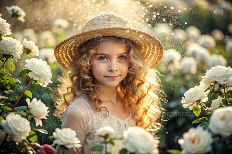 Портрет красивой кудрявой девушки в соломенной шляпе и платье в цветущем розовом саду. Детство. Девочка позирует и смотрит в камеру