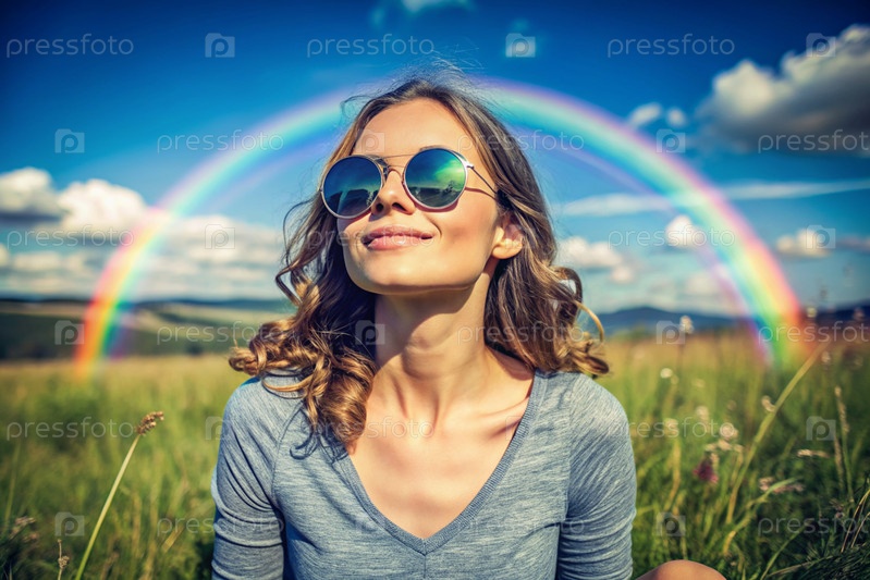 Счастливая женщина-хиппи в круглых солнцезащитных очках на фоне радуги.Девушка занимается медитацией и глубоким дыханием
