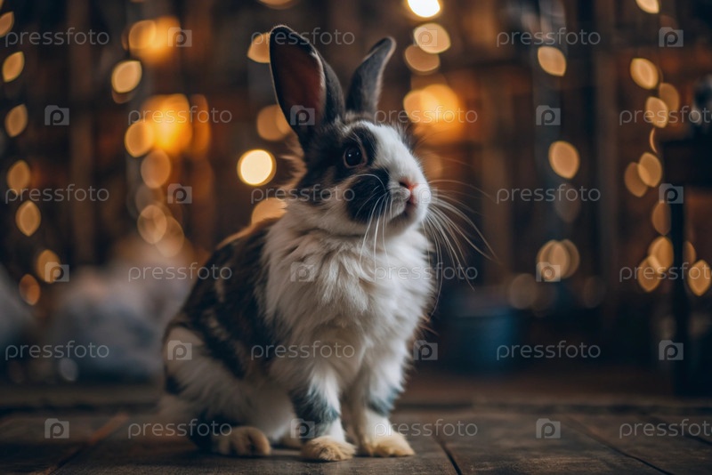Маленький пушистый бело-черный кролик в качестве домашнего питомца во внутренней части квартиры