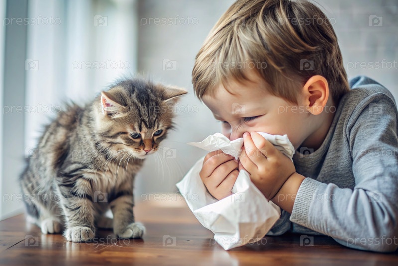 Маленький мальчик чихает в белую салфетку дома. Аллергия на волосы кошек и домашних животных. Рядом со мной сидит котёнок