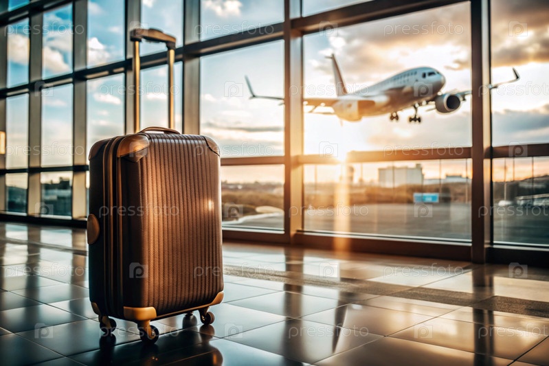 Чемодан в пустом аэропортовом салоне, сумки для путешествий в терминале вылета, концепция летнего отдыха, пространство для текста или дизайна
