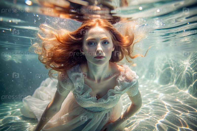 Портрет красивой рыжеволосой девушки в модном белом платье под водой на глубине