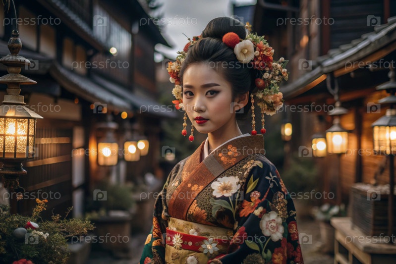 Японская девушка в традиционном национальном костюме - кимоно. На фоне домов, фонарей и вишневых деревьев портрет символизирует традиции и культуру народа Японии