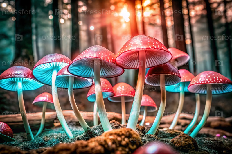 Ядовитые грибы. Жабы. Галлюциногенные грибы. Светящиеся грибы. Изображение для иллюстрации тем, связанных с природой, фантазией, сказками и магией