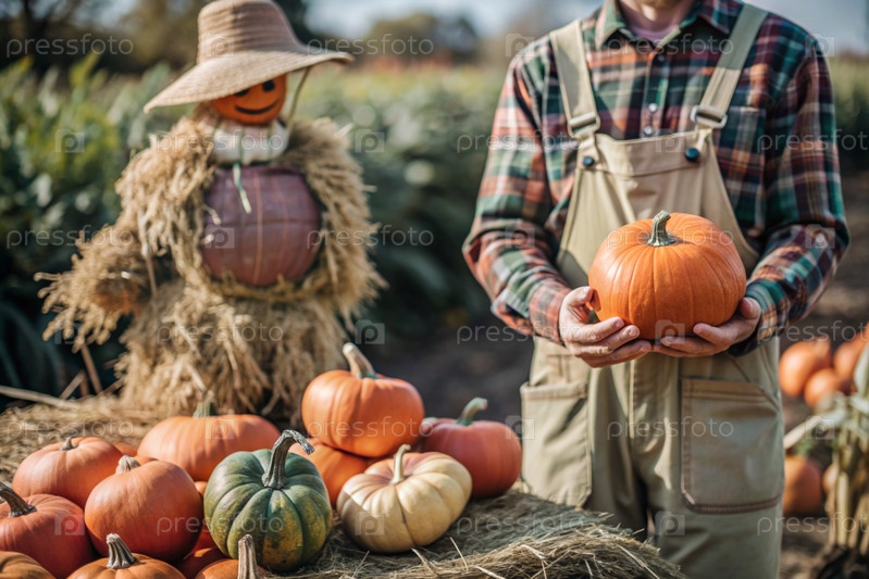 Руки мужчины в квадратной рубашке с тыквенным крупным планом и красивым осенним рисунком. Сбор тыков. Концепция празднования Дня благодарения и Хэллоуина