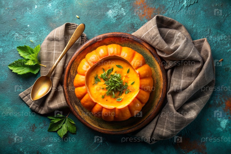 Традиционный мягкий тыквенный кремовый суп с сливками и семьями тыквы на бирюзовом бетонном фоне