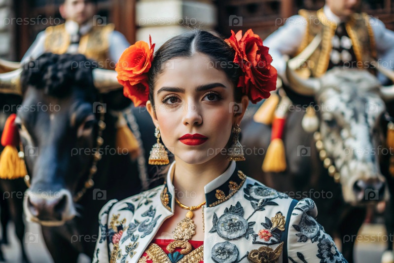 Испанская девушка в традиционном испанском национальном костюме. Перед быком. Бикоборство. Портрет символизирует традиции и культуру народа Испании