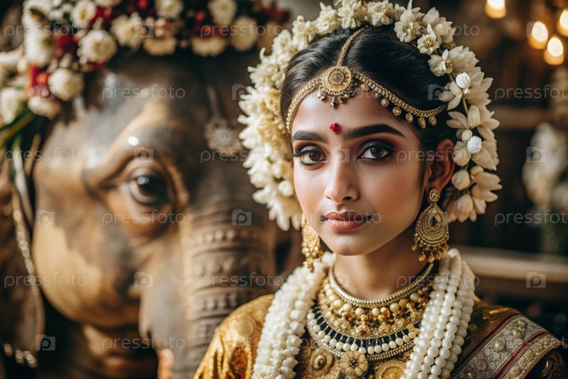 Красивая индийская девушка в традиционном национальном костюме, сари. со слонами. портрет символизирует традиции, культуру и красоту народа Индии