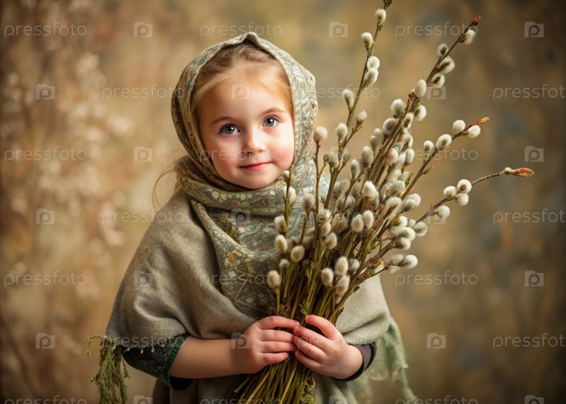 Пальмовое воскресенье. христианство. портрет трехлетней девочки в русском народном шале с ветвями ивы в руках на фоне цветущей ивы