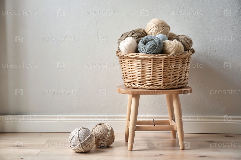 шарики пряжи в корзине из плесеня в белых и бежевых тонах швейная работа, текстиль, вязание зимний сезон, малый бизнес, ручная одежда