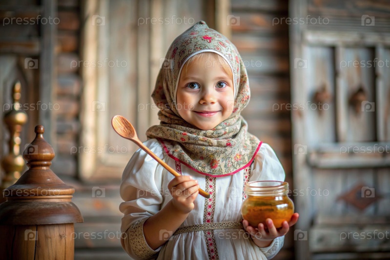 Концепция российского православного праздника 'Мед Спаситель' - красивая маленькая девочка в русской национальной одежде и шарф с баночкой меда на фоне православной церкви