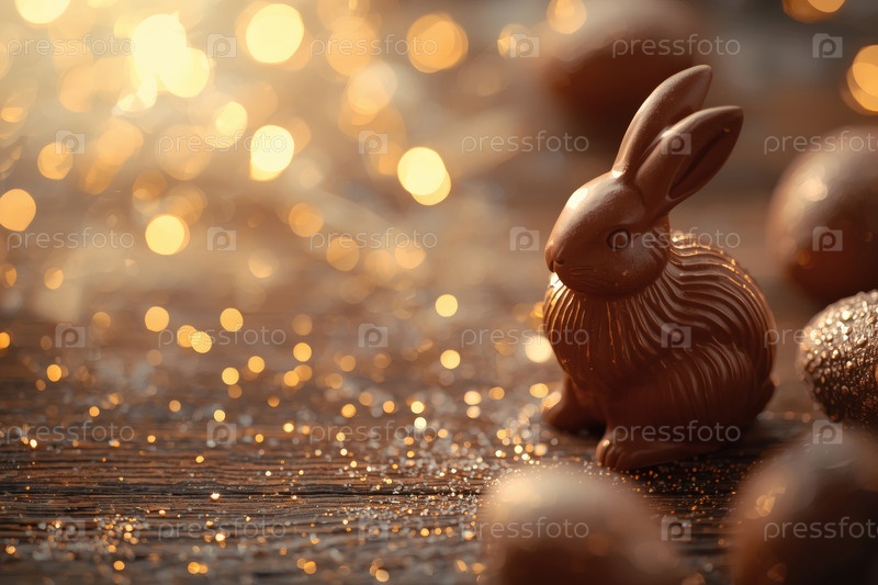 Концепция ярких пасхальных праздников в 2026 году. Красивая открытка. Баннер. Шоколадные пасхальные яйца и шоколадное зайцо на деревянном фоне. Пасхальные сладости и лакомства