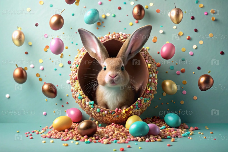Известный праздник. милый пасхальный кролик заглядывает из ямы с красочными яйцами вокруг. концепция счастливой Пасхи
