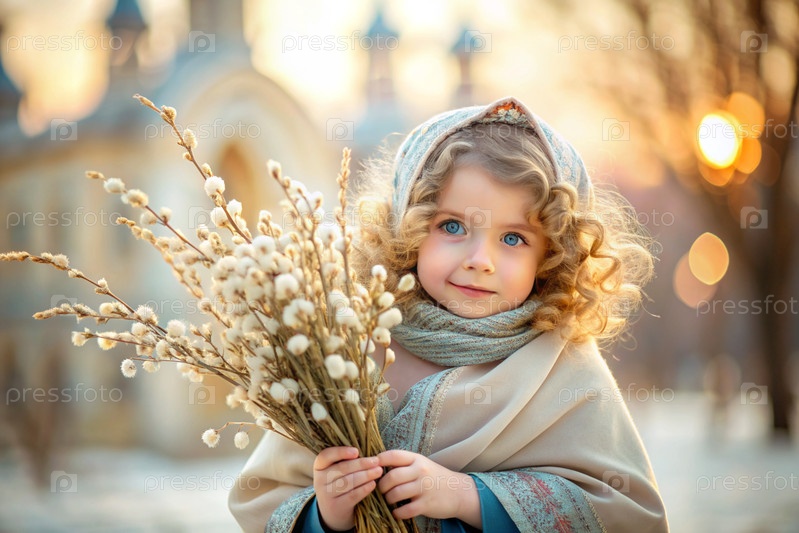 Пальмовое воскресенье. христианство. портрет трехлетней девочки в русском народном шале с ветвями ивы в руках на фоне православной церкви